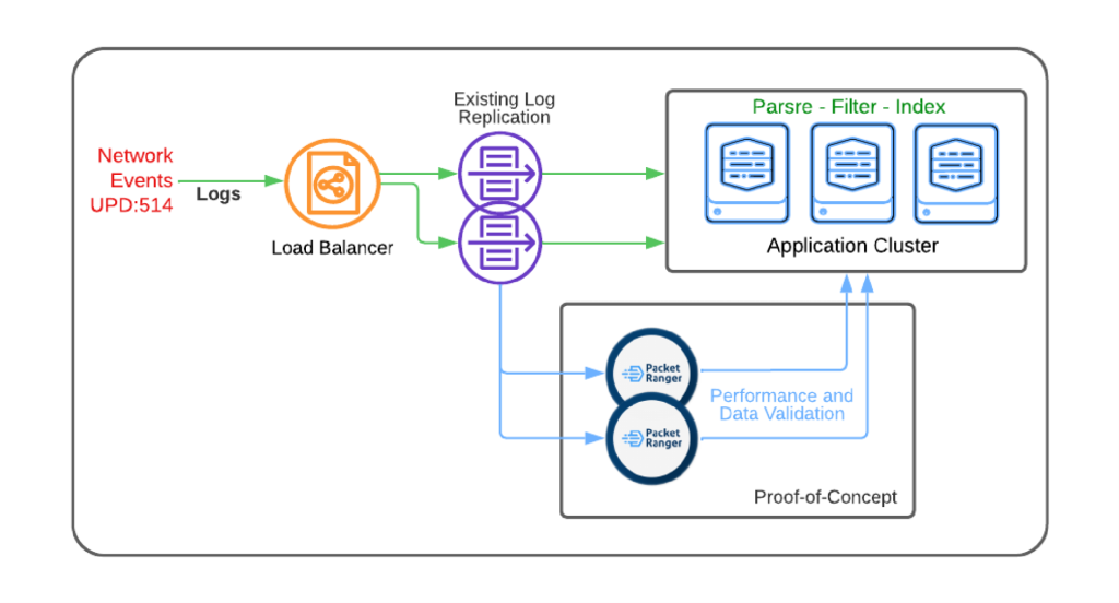 Company configured their existing log replication solution to bifurcate all log and telemetry data to pair of redundant PacketRangers. This production network proof-of-concept (PoC) provided the requisite continuity in preserving their observability data, aggregating key network metrics, and delivering log and telemetry data to numerous downstream management applications. Company could then make a direct comparison of Tavve’s PacketRanger against their existing solution using production log data and volumes.